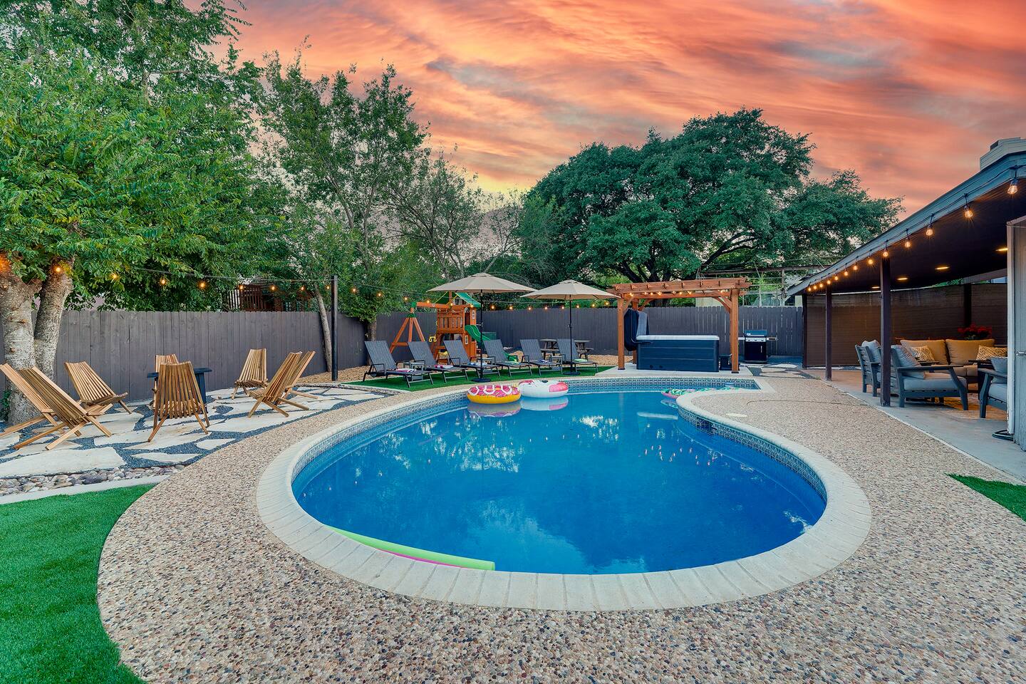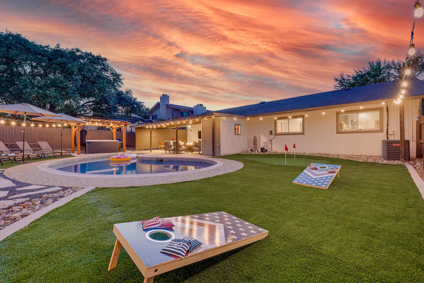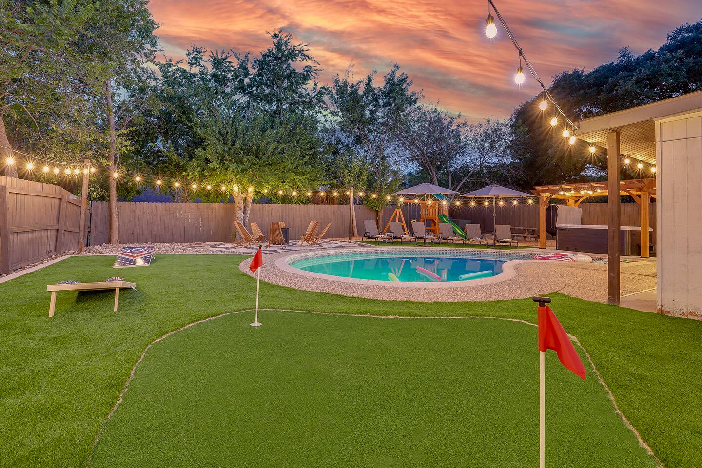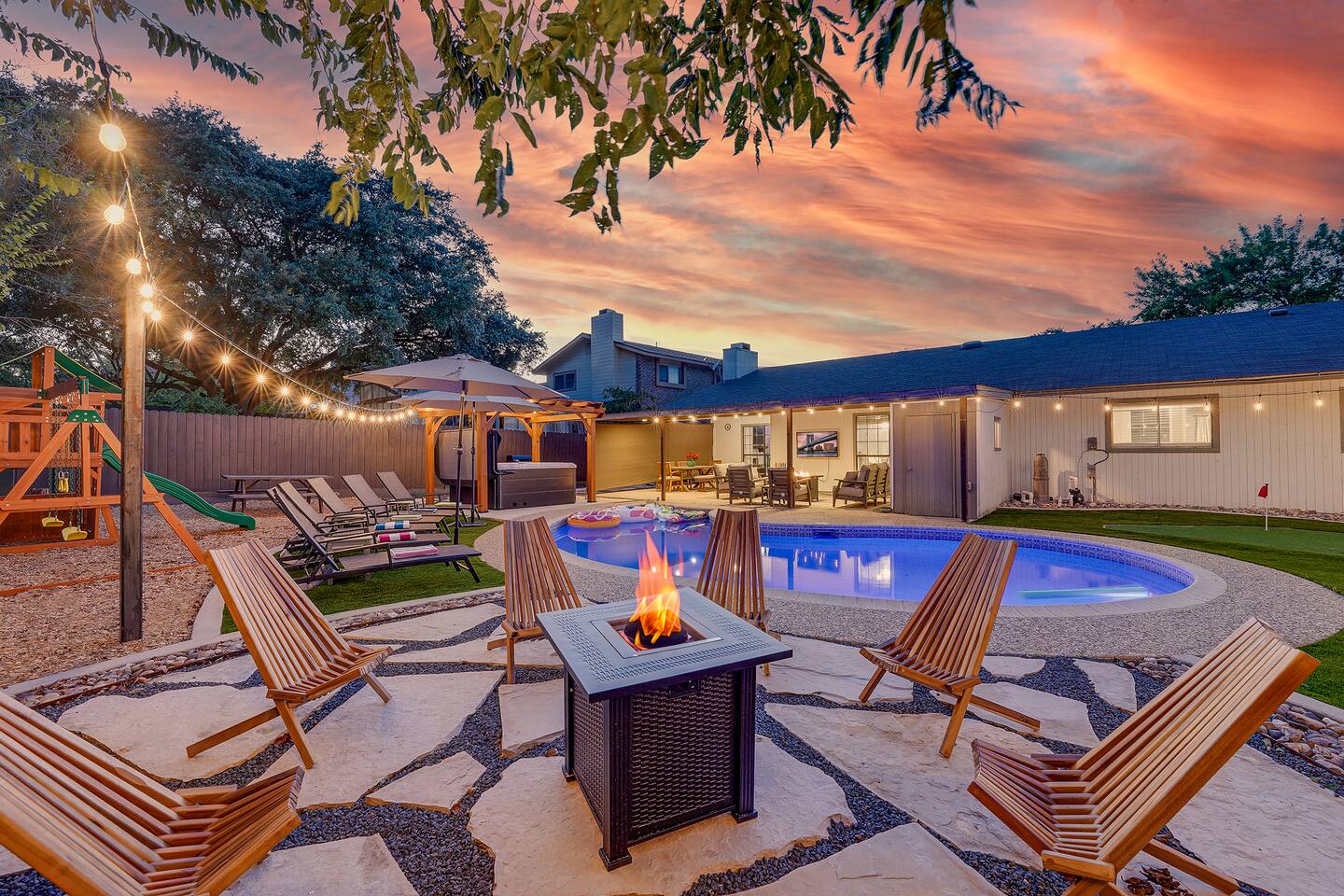 Welcome to SATX, the ultimate San Antonio vacation home, designed with luxury, comfort, and entertainment in mind—perfect for families, friends, and military personnel visiting the area. This property offers every amenity you could need for a memorable stay, whether you're here for a relaxing getaway or celebrating a special occasion. We had some reviews mentioning our Hot Tub prior to Nov 2025, yes we had a lemon of a tub and a company that took forever to find parts for us. We have installed a new, much more reliable tub as of Nov 20, 2025, we hope that it is much easier to operate and is more reliable. Gather around the multiple gas fire pits for cozy evenings or fire up the Weber BBQ grill to enjoy a Texas-style feast. Spend your days relaxing by the sparkling pool, soaking in the hot tub, or playing a competitive game of put put golf and cornhole. With plenty of pool toys for the kids, there’s something for everyone to enjoy. Inside, unwind in luxurious beds with high-end linens for a perfect night's sleep, and take advantage of the fully stocked kitchen to prepare meals for the whole group. Stay cool with Ice cold air conditioning, and enjoy gathering in beautifully designed common spaces. Conveniently located just 20 minutes from Randolph Air Force Base and 30 minutes from Lackland Air Force Base, this Airbnb is ideal for military families visiting loved ones or attending special events. You’re also just minutes away from San Antonio’s best attractions, including the River Walk, The Alamo, 6 Flags, Sea World, historic river tours, Morgans Wonderland, and top-notch restaurants. Only 1 hour away from the world’s largest Buc-ee’s! Experience the perfect blend of relaxation and adventure, book your stay now and enjoy everything San Antonio and the surrounding area have to offer!